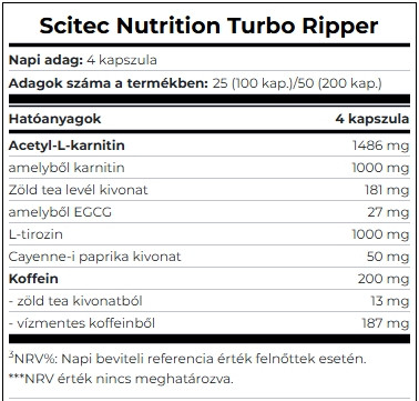 Mindezeken kívül a TURBO RIPPER igencsak komoly, 200 mg koffeint tartalmaz adagonként, amely több forrásból származik, beleértve a levédett NEWCAFF ™ mikrokapszulázott, nyújtott hatású koffeint. Ez egy teljesen új koffein-szállító rendszer, amely a teljes koffeintartalom felszívódását mintegy 4 órás időtartamra nyújtja.